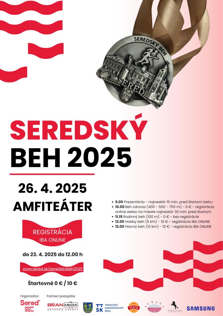 Mesto Sereď v spolupráci s partnermi SEDITA Sereď, BRANMEDIA outdoor agency , Šintavan s.r.o., Samsung, Agrana s.r.o., a iných partnerov, pozýva všetkých športových nadšencov na celomestské podujatie Seredský beh, ktorý sa bude konať 26. apríla 2025